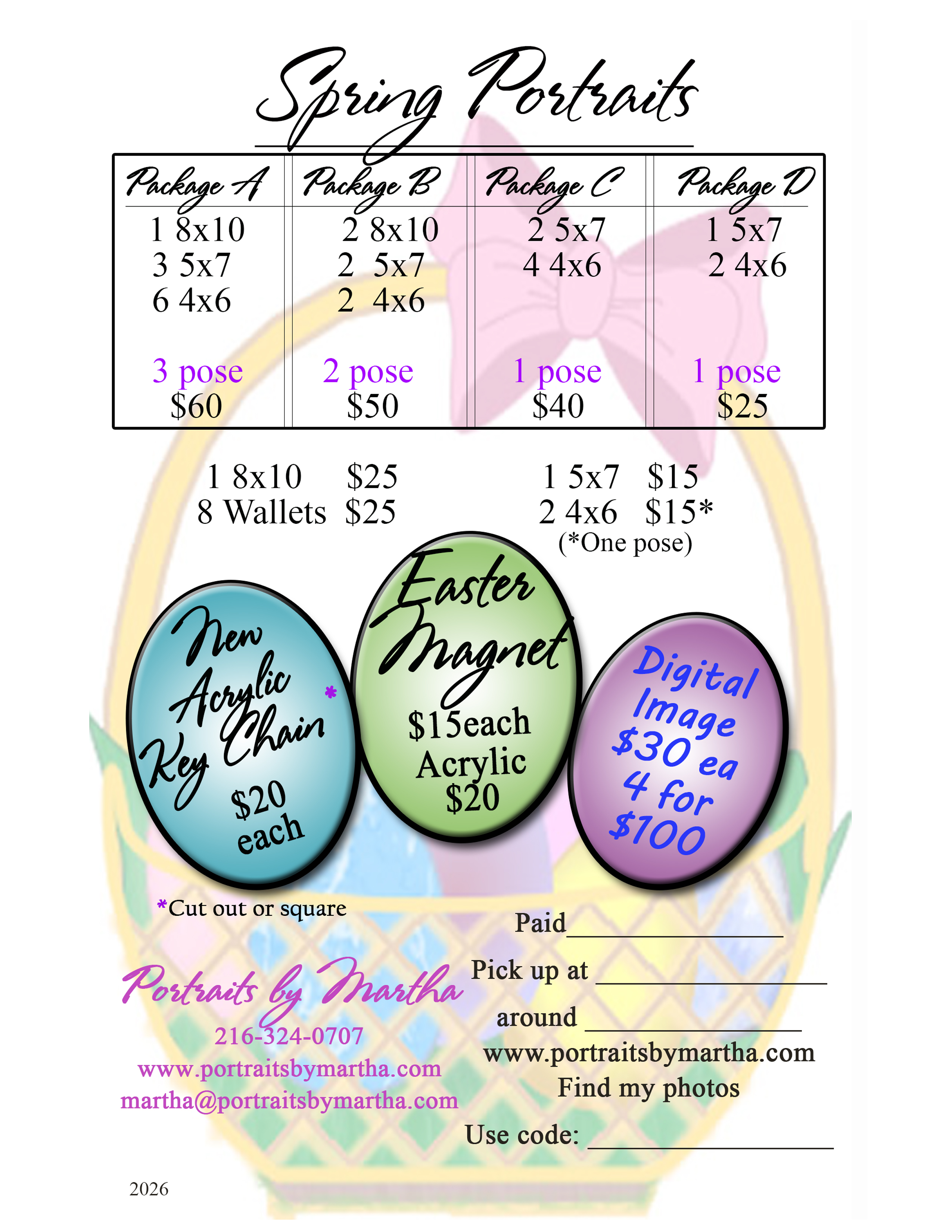 Call 216-324-0707 or email portraitsbymartha@whateverwhatever.com for pricing and scheduling information.
